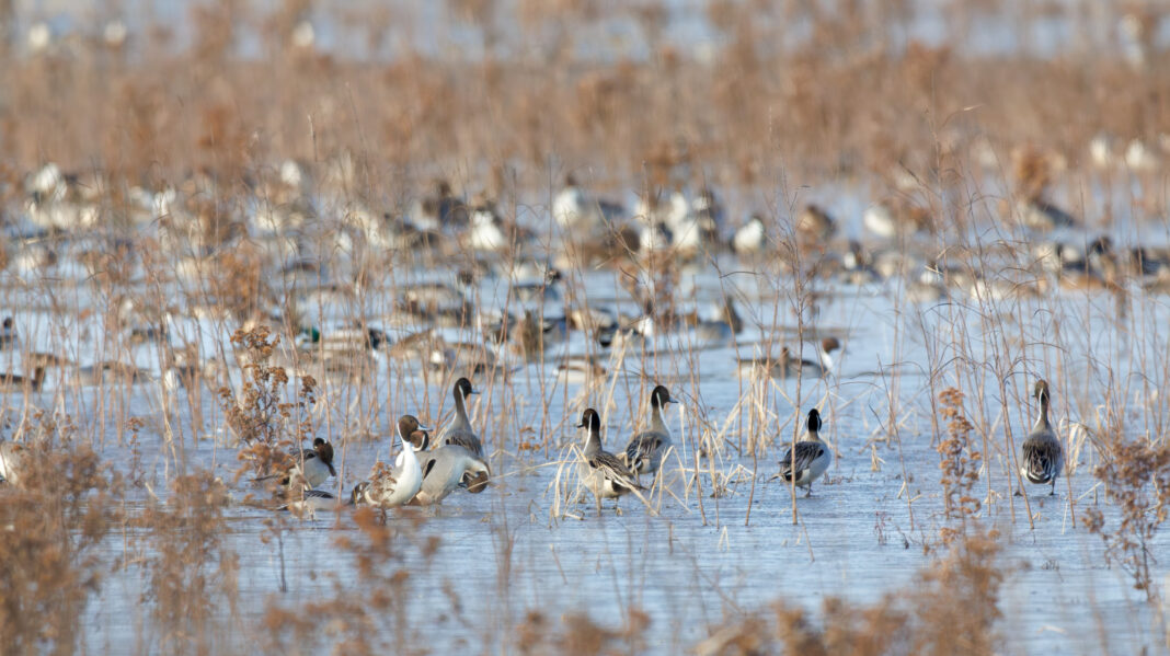 Leach wrote in his report: “While the current forecast includes light precipitation after the New Year, it lacks the volume necessary to alleviate the deficit. Early in the survey period, icy conditions caused ducks to congregate in tight clusters; however, subsequent warming allowed the birds to disperse across the landscape a bit more.”
